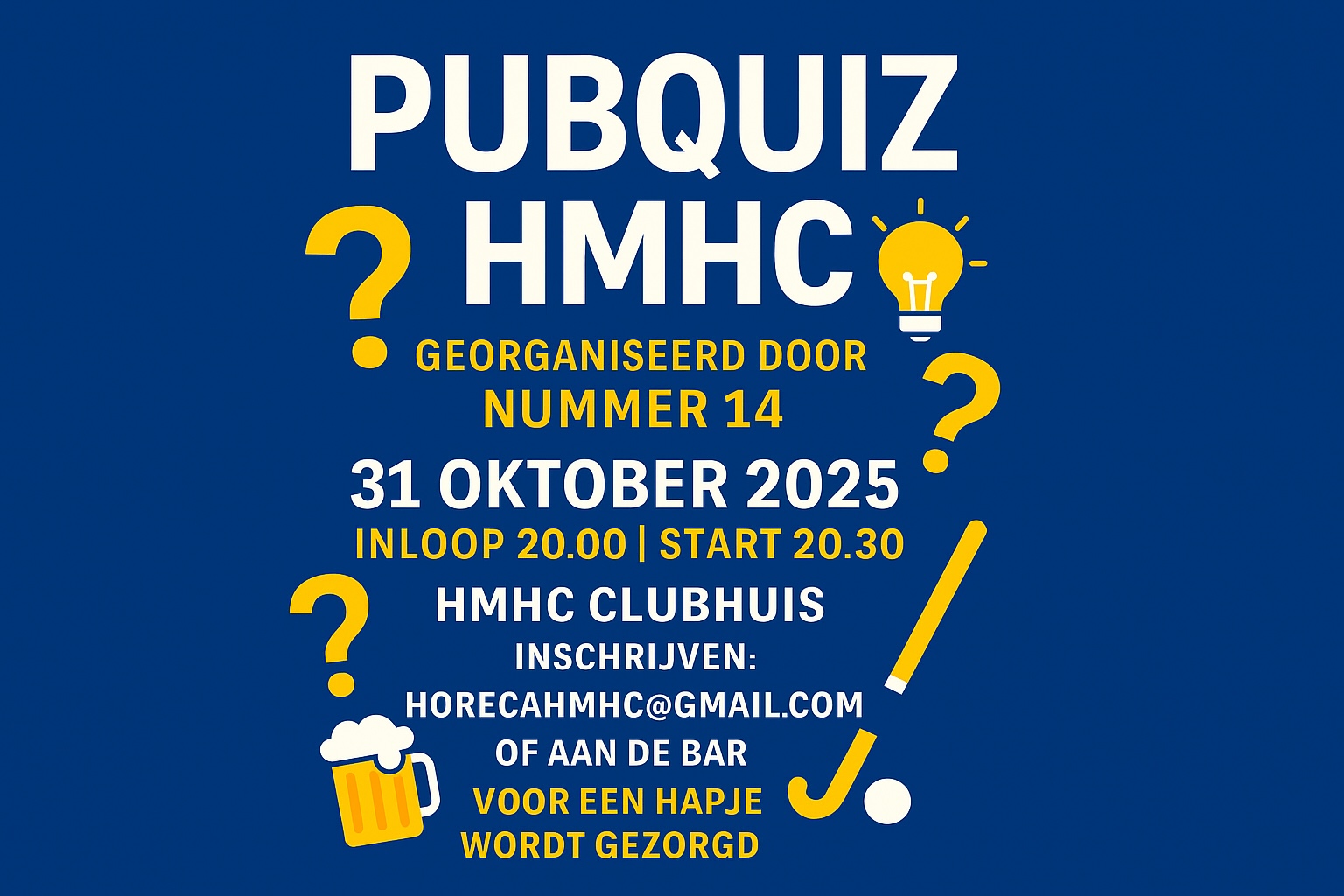 Op vrijdag 31 oktober organiseert Nummer 14 de enige echte HMHC Pubquiz in het clubhuis! 🤩